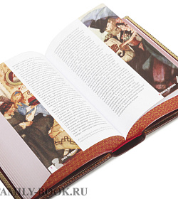 Тиснение золоченое и блинтовое, а на корешке, окатанны ручным способом, бинты. Обрез трехсторонний, золотой, который спасает подарочную книгу от повреждений.