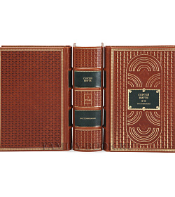 Тиснение золоченое и блинтовое, а на корешке, окатанны ручным способом, бинты. Обрез трехсторонний, золотой, который спасает подарочную книгу от повреждений.