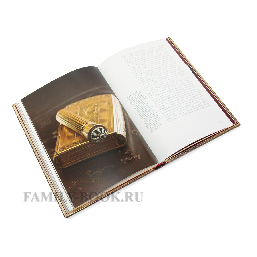 Тиснение золоченое и блинтовое, а на корешке, окатанны ручным способом, бинты. Обрез трехсторонний, золотой, который спасает подарочную книгу от повреждений.